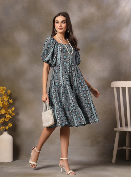 Features: Printed Pattern, Knee Length, Fit & Flare, Flared Hemline