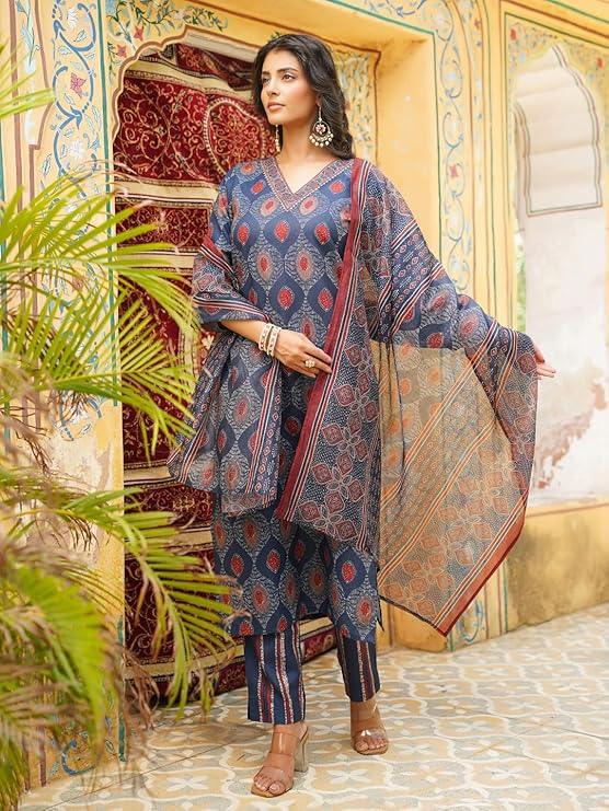 Pre Order Blue Plus Rayon Blend Kurti With Pants & Shawl Set (M to 4XL)