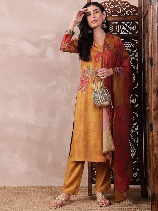 Pre Order Plus Mustard Rayon Blend Kurti With Pants & Shawl Set (S to 3XL)