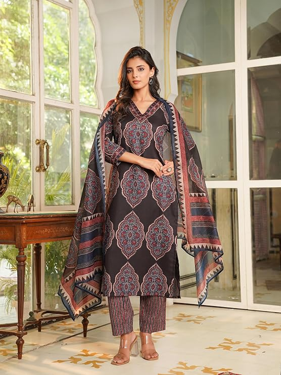 Pre Order Plus Black Rayon Blend Kurti With Pants & Shawl Set (M to 4XL)