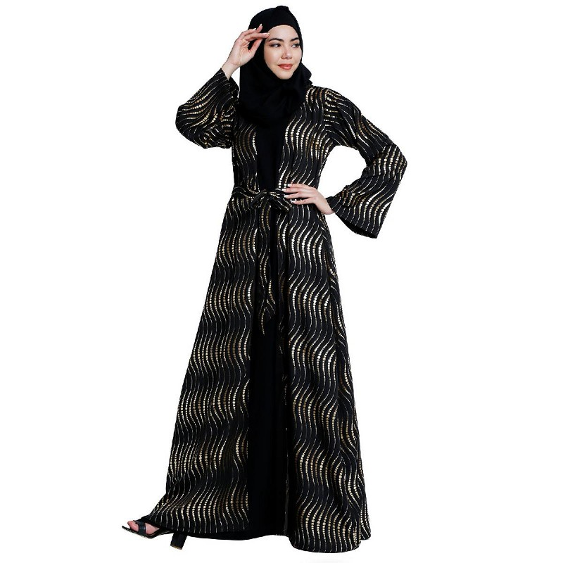 Pre Order Black-Golden Foil Nida Matte Kimono Abaya with Hijab (XS to 3XL)