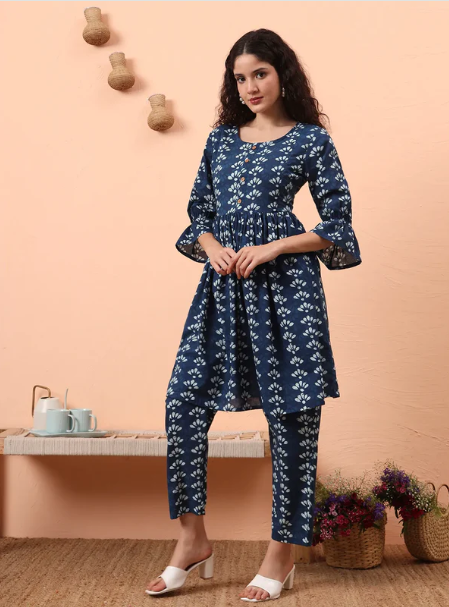 Pre Order Navy Blue & White Cotton Anarkali Maternity Kurti With Pants (M to 3XL)