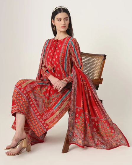 Pre Order Red Silk Kurti With Pants & Shawl (M to 3XL)