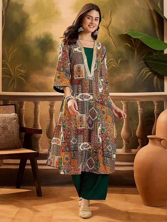 Features: Calf Length, Batik Print & Embroidered Pattern